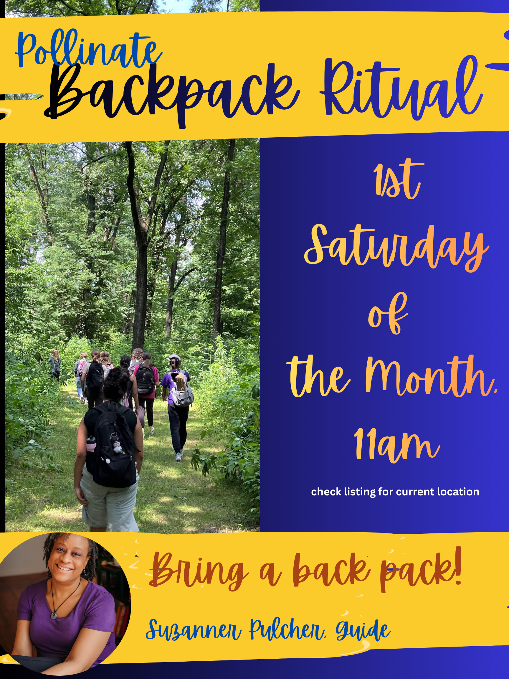 The Back Pack Ritual helps you identify what weight you carry on a daily basis, how you carry it and when to release it. Supported by nature and your fellow hikers, you can step into contemplation, movement and release of that which you carry. Facilitated by Suzanne Pulcher.